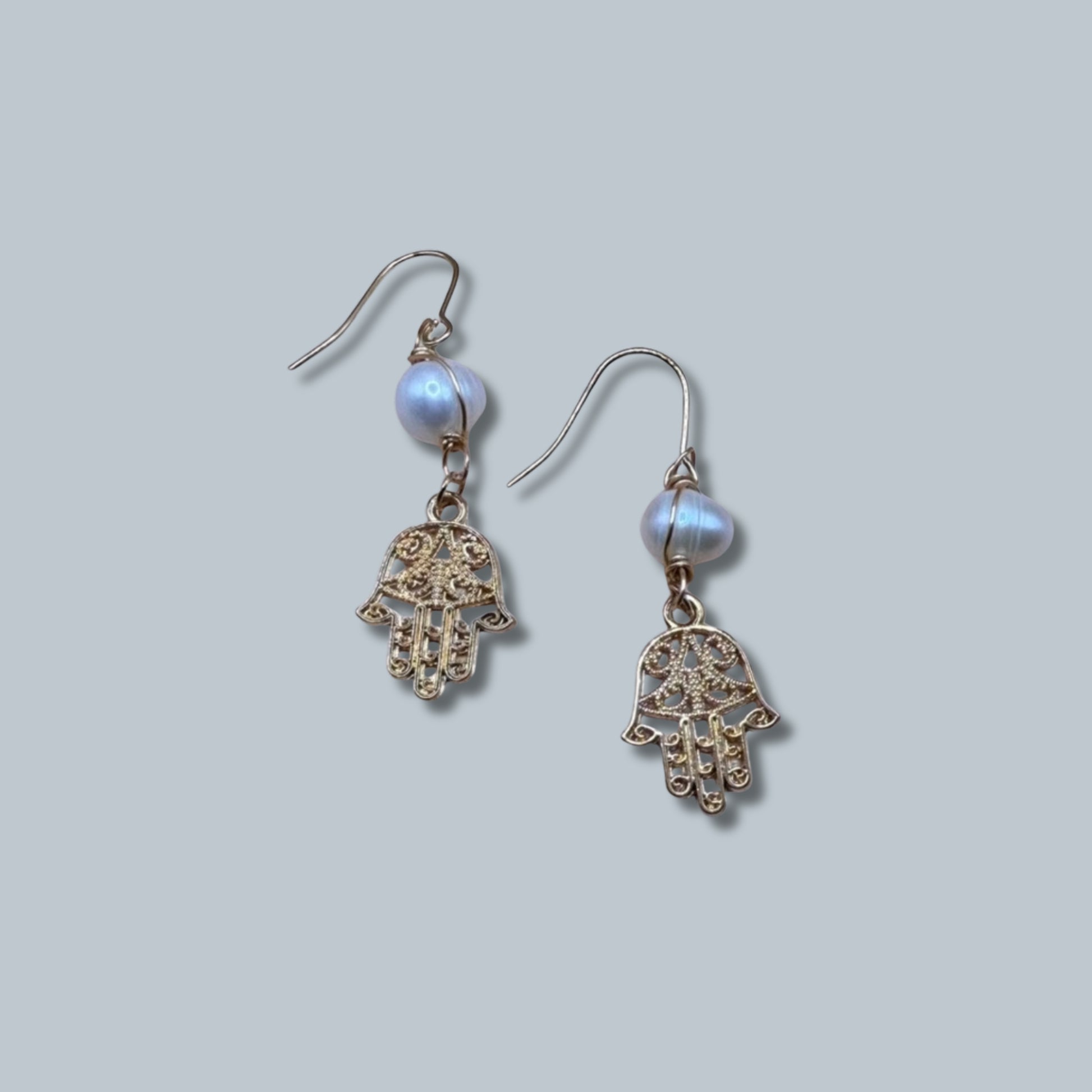 Elegant gold Hamsa earrings with lustrous pearls, deliver boho charm and spiritual symbolism. They are perfect for everyday or statement wear.
