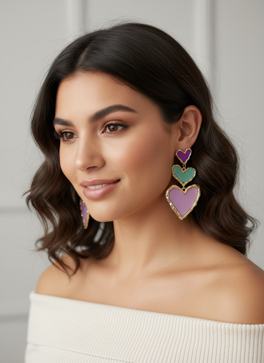 Triple the hearts, triple the fun! These pretty super lightweight dangles bring a burst of colour and fun to every outfit.
