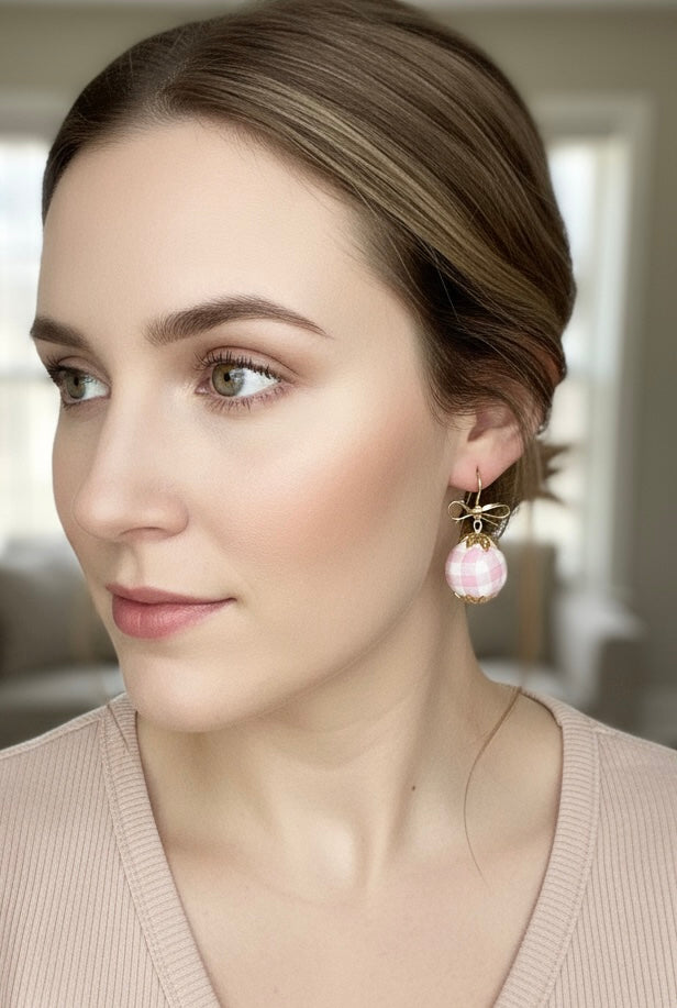 Lightweight and charming, these gingham print drop earrings bring a sweet vintage touch to any look. Finished with delicate gold bows for a playful, feminine flair.