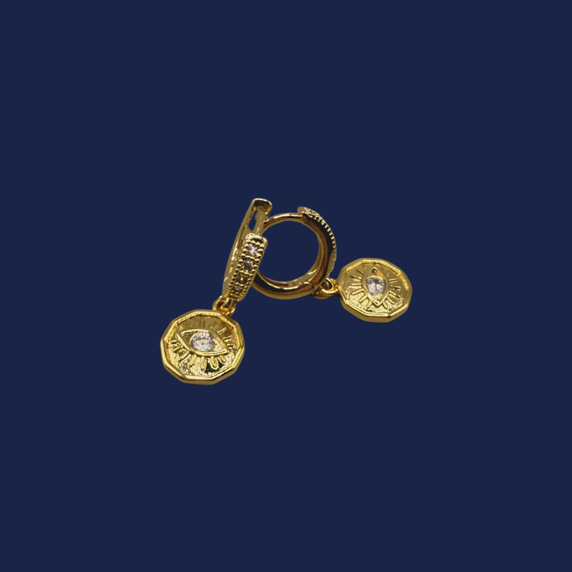 Radiant and mystical, these huggies shine with a circular charm paired with an evil eye accent for a touch of intrigue. The perfect balance of minimalist design and statement detail.