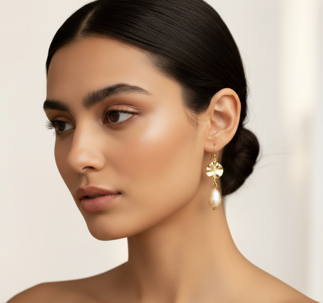 Elegant drop earrings featuring textured gold and lustrous pearls. They are timeless, refined, and perfect for elevating any outfit.