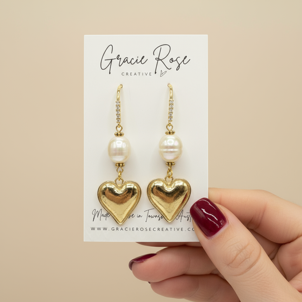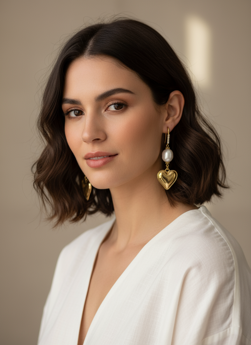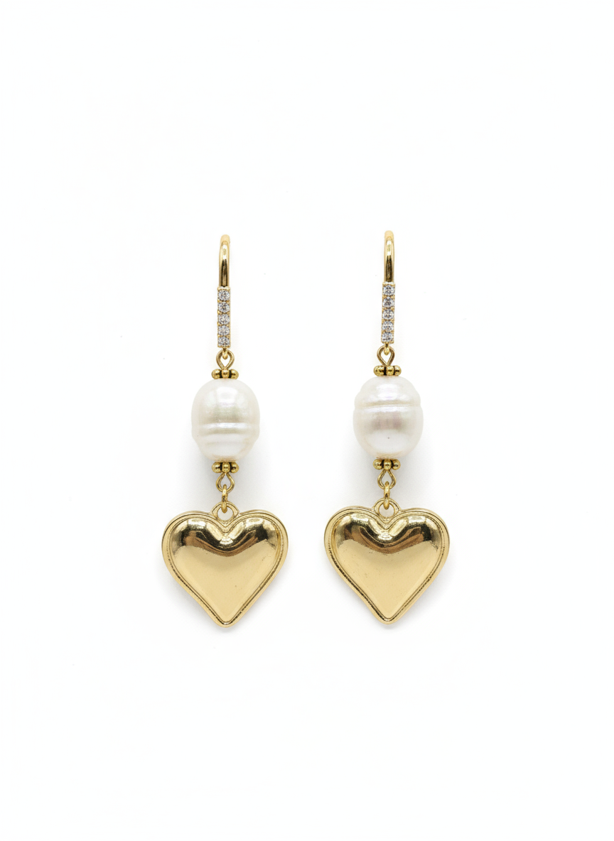 Romantic and radiant, these earrings pair luminous baroque pearls with sculpted gold hearts. A graceful fusion of timeless charm and modern elegance.
