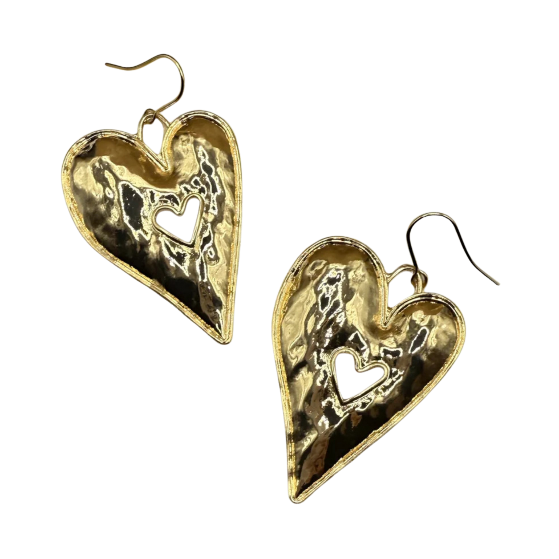 Romantic and radiant, these earrings feature sculpted golden hearts with delicate cutouts, catching the light—and glances—with every graceful turn. A love-worn treasure.