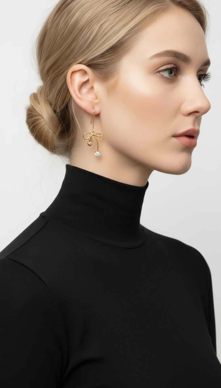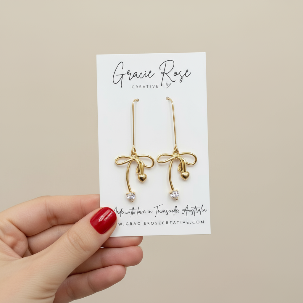 These long delicate gold bow earrings adorned with tiny hearts and sparkling crystal drops are perfect for adding a sweet shimmer to any look.