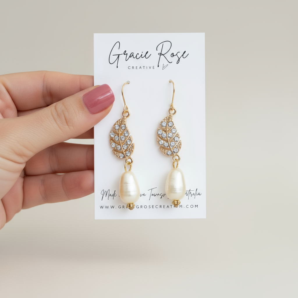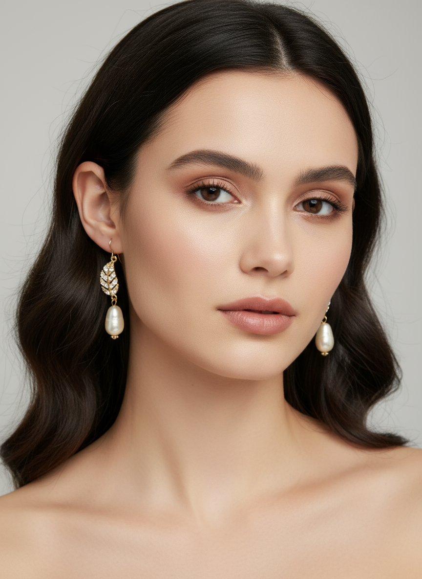 Crystal-studded golden leaves cascade into luminous pearls, capturing nature’s elegance. They bring a refined shimmer to every movement and moment.