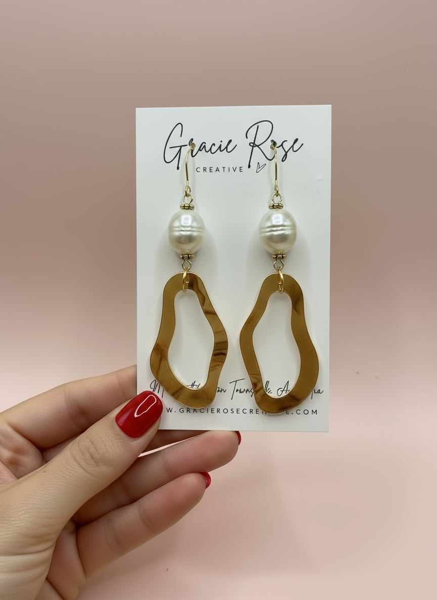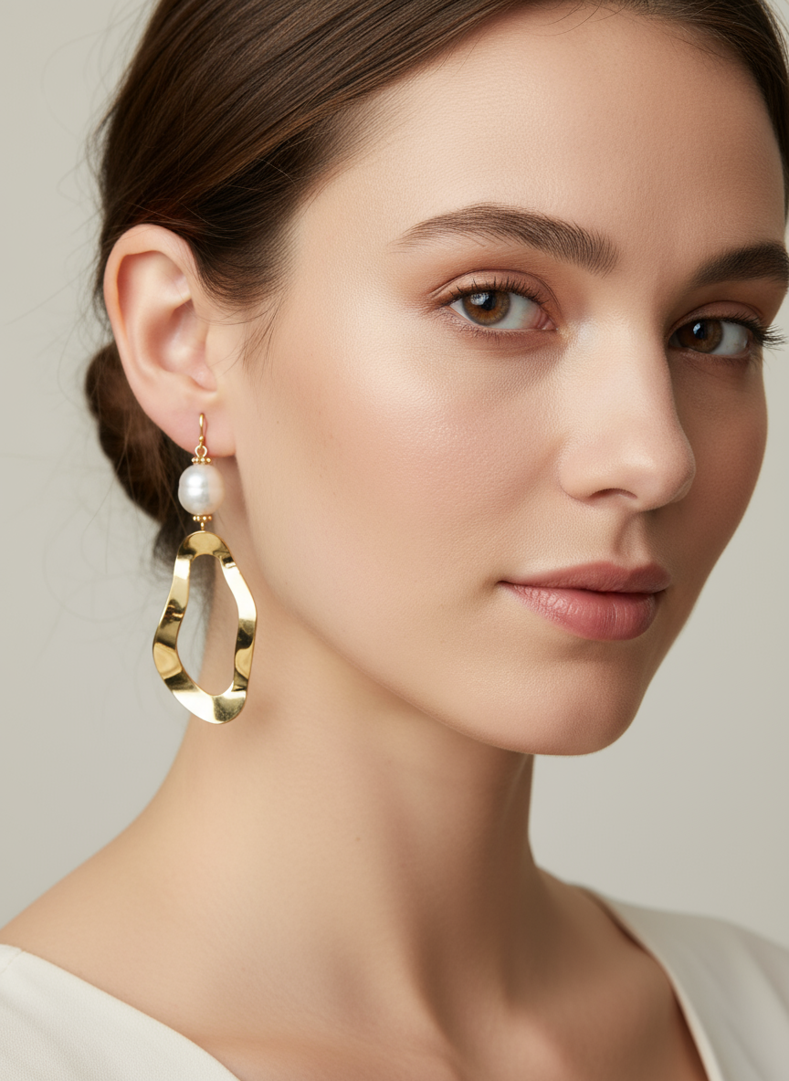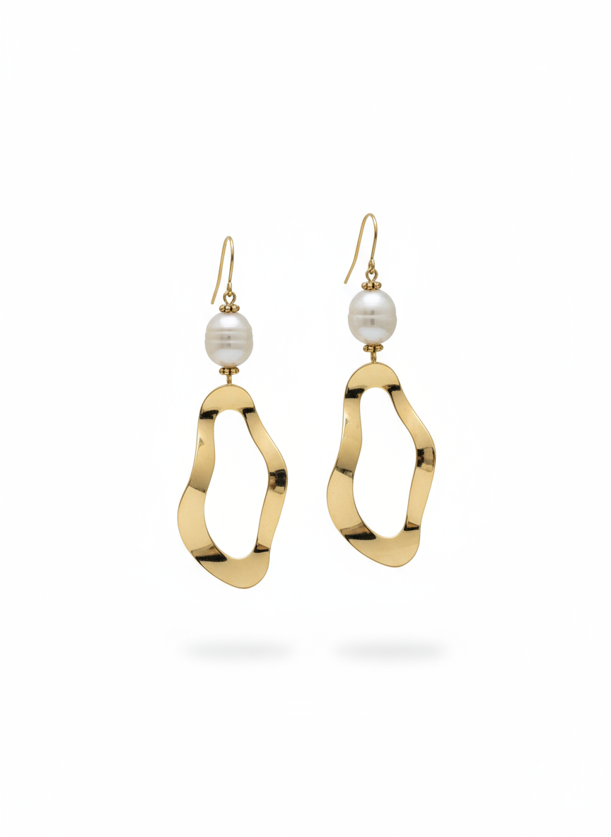 These elegant modern gold wave earrings paired with luminous pearls are elegant, fluid, and perfect for adding a touch of coastal chic to any look.