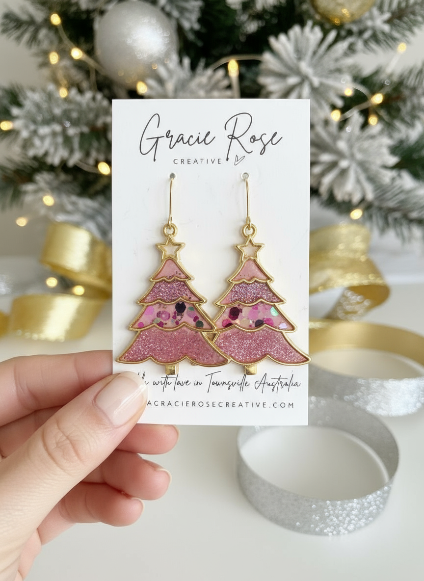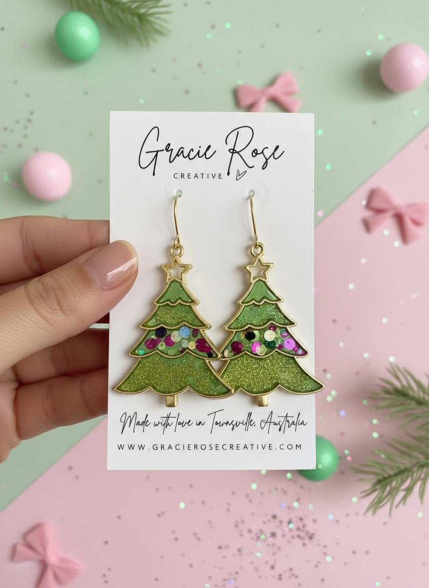 Add some Christmas cheer with these handmade glittery Christmas tree earrings! Featuring gold trim, colourful confetti details, and lightweight festive charm.