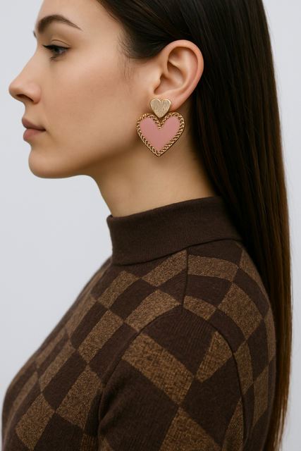 Bold and playful, these pink heart earrings feature a textured gold top and braided trim. They're perfect for adding a sweet, statement touch to any outfit.