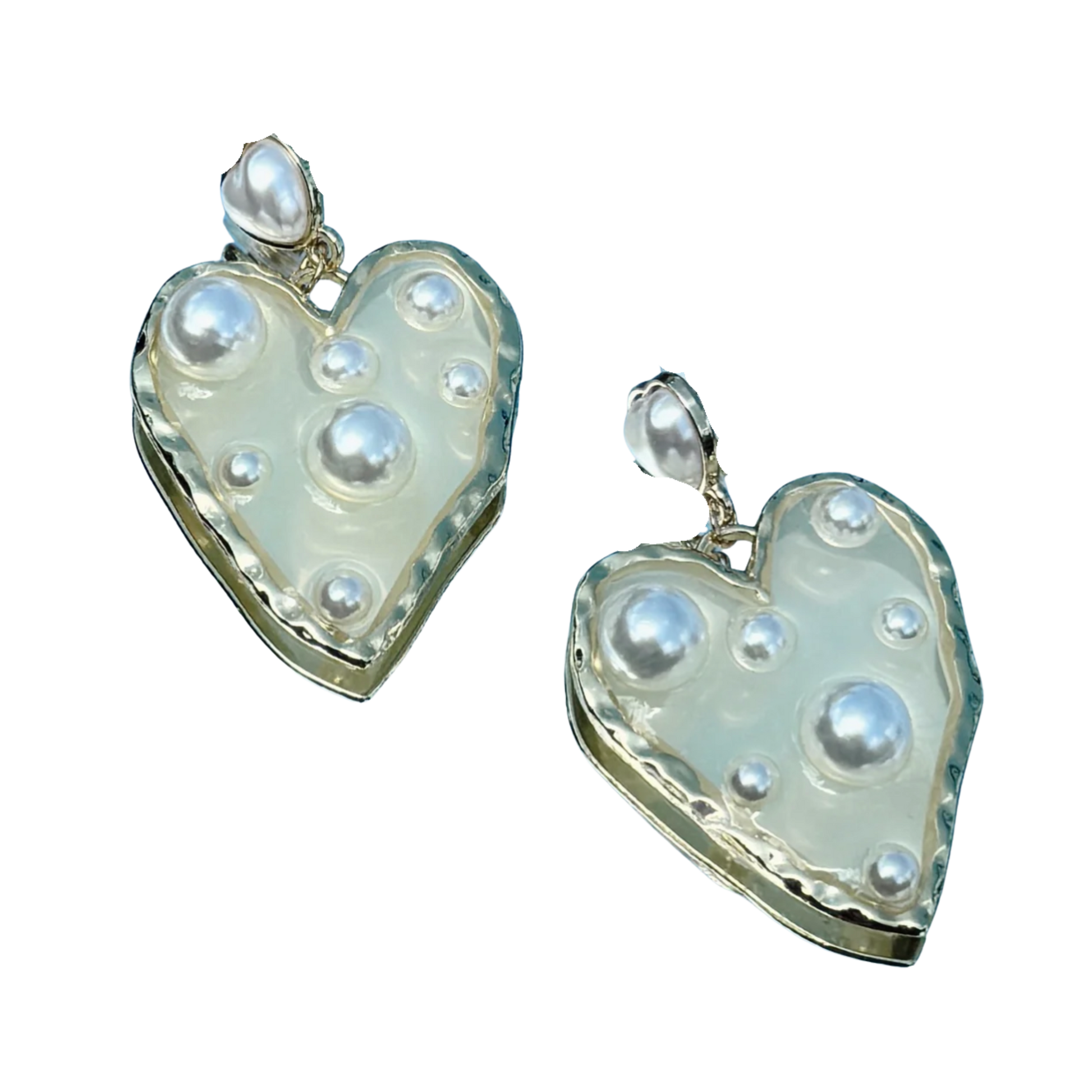 Fall in love with elegance! These handcrafted earrings feature lustrous pearl-like accents nestled within golden heart frames. A timeless statement of romance and charm.