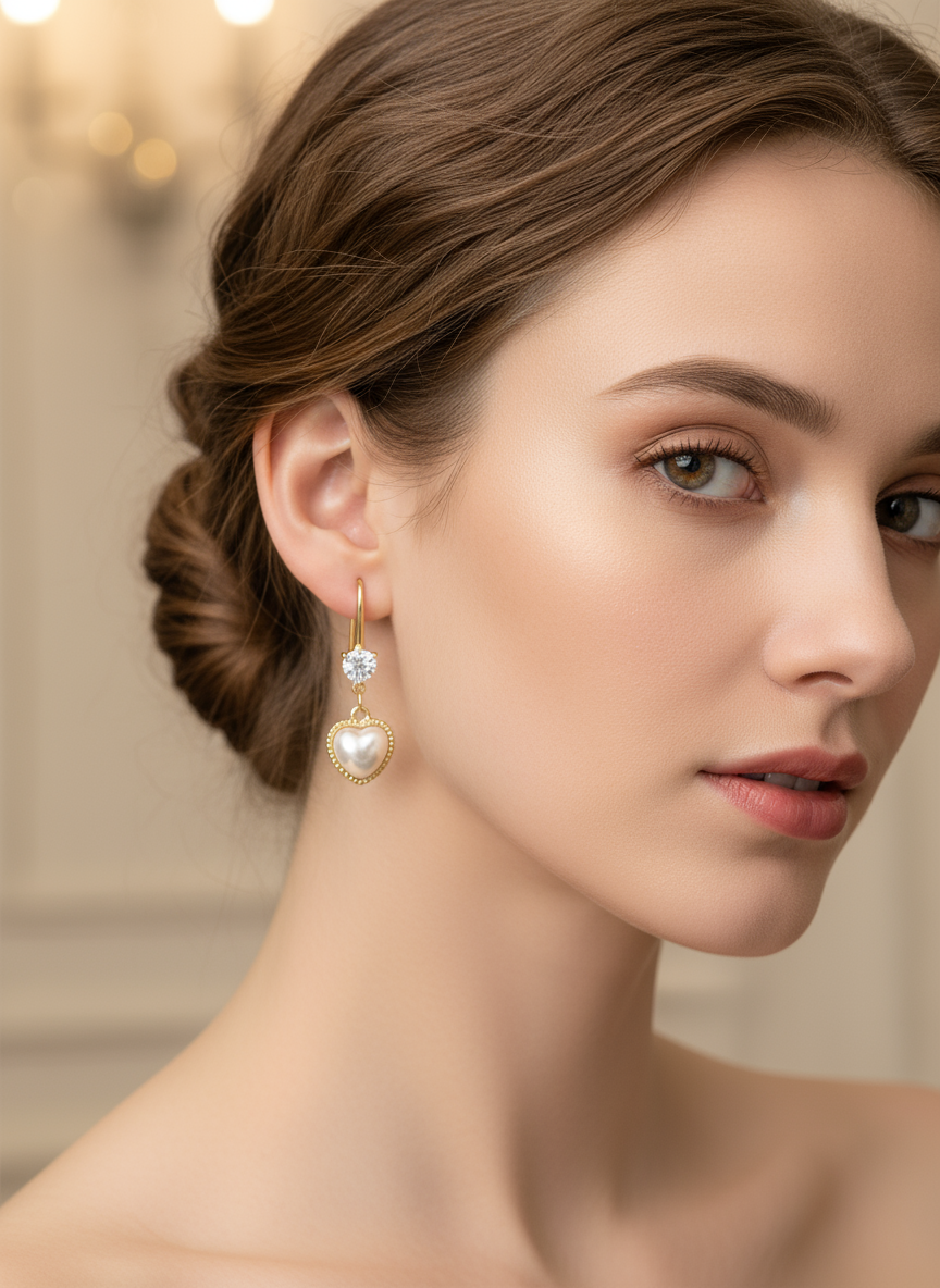 Playful pearl hearts framed in gold, finished with a sparkling crystal accent. Lightweight, glossy, and designed to add a cheerful shimmer to every wear.
